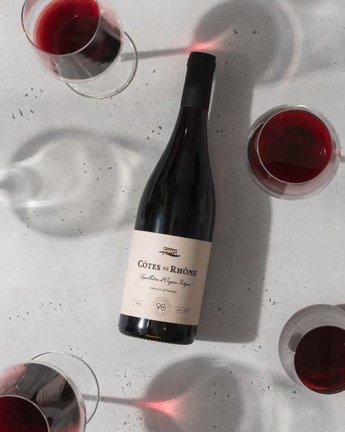 This wine is made from a blend of 60% Grenache and 40% Syrah hand-harvested from select vineyard plots scattered about France’s Southern Rhone Valley. In this dry, Mediterranean climate, vine roots dig deeply into the valley’s soils of limestone and clay. The grapes are destemmed and fermented under cooler temperatures to preserve the fresh fruit and savory character of the wine.